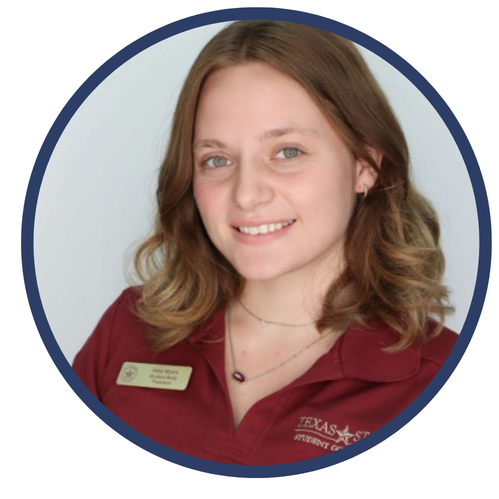 As a first-generation college student, Abby understands the challenges of pursuing higher education. She is working toward a B.A. in Honors Psychology with a minor in Business Law at Texas State University. She has been recognized for her dedication to service and community impact through leadership roles during her time at the university. These include serving as the 61st Student Body President, Vice Chair of the Texas State University System Student Advisory Board, Presidential Ambassador, and member of the Honor Code Council. In each role, Abby discovered the importance of active participation in building community and developed a passion for advocacy. Her experience in policy revision, initiative implementation, and public speaking will enable her to be the best possible advocate for college students across Texas. Abby loves Gilmore Girls (speaking fast and drinking coffee are two of her favorite pastimes), reading, hanging out with friends, and finding ways to uplift the people in her community.